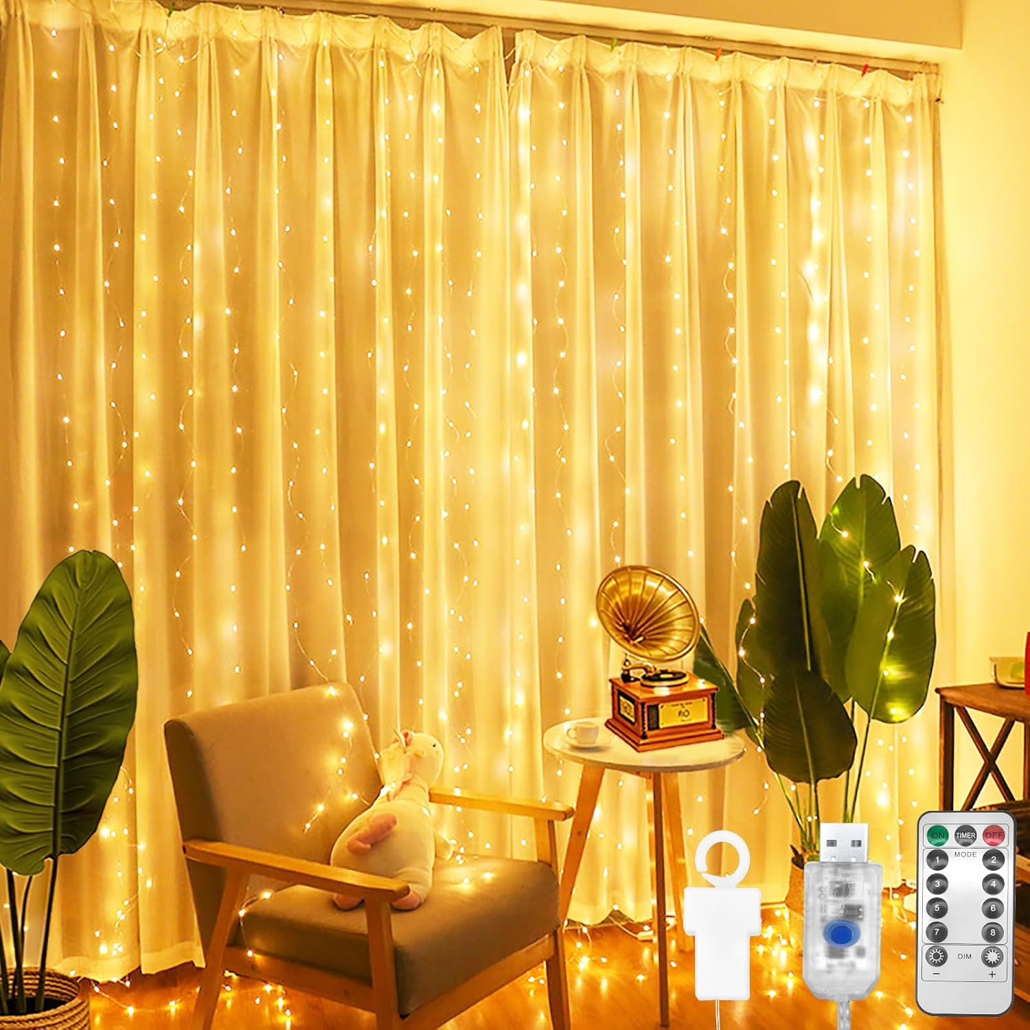 Vulisox Curtain Fairy Lights Indoor, 3mx3m 300LED Curtain Light USB Powered Waterproof String Lights 8 Mode Remote Control Timer, Fairy Lights for Christmas, Garden, Home Decor(Warm White)