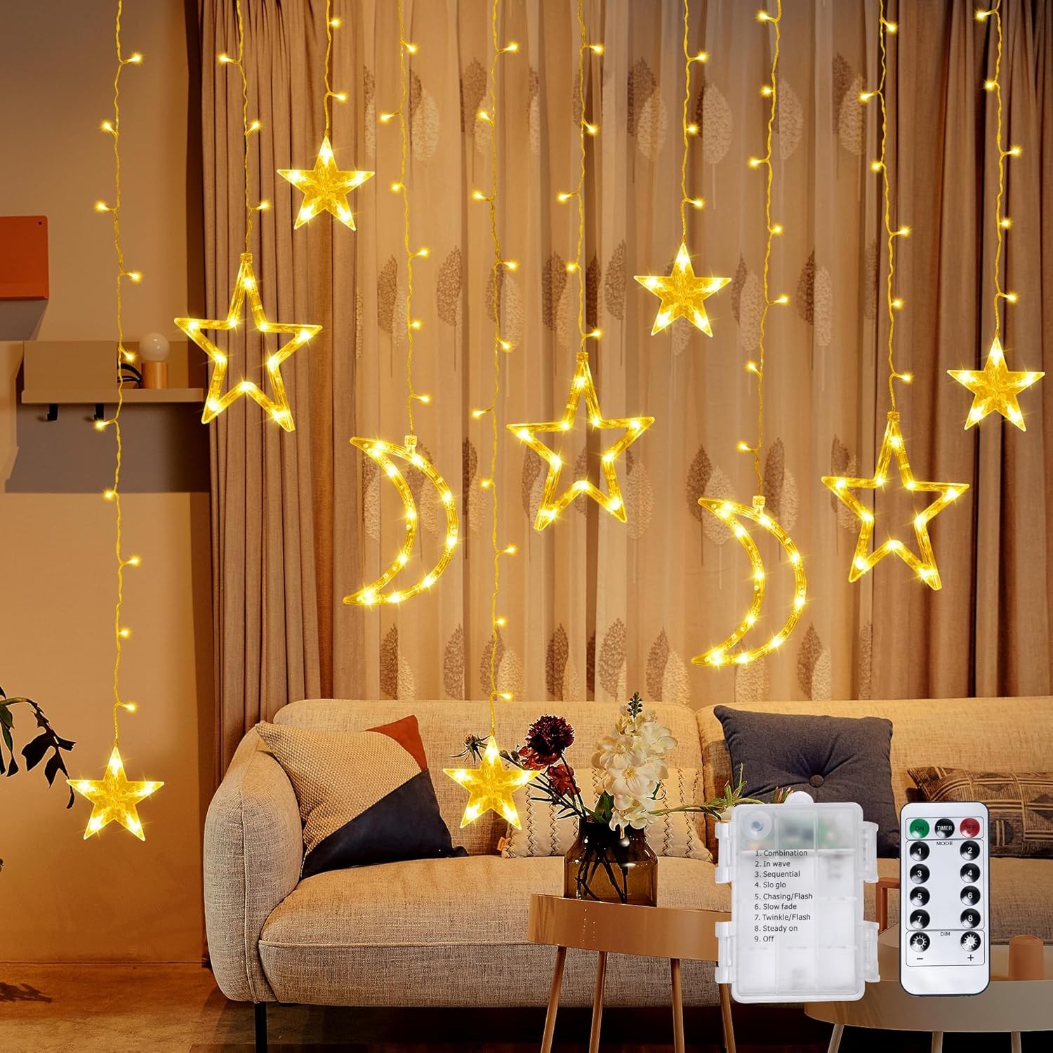 Ramadan Curtain String Lights, 135 LED 3M Star Moon Curtain Fairy Lights with 8
