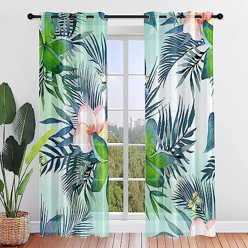 Odot Voile Sheer Curtains 2 Panels for Living Room, Tropical plants Prints Semi Sheer Curtains Light Filtering Tulle Eyelet Curtains Drapes for Bedroom Windows (W55 x L108,Green leaf 4)