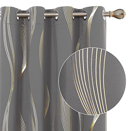 Deconovo Grey Eyelet Blackout Curtains, Gold Wave Foil Printed Curtains for Living Room, 52 x 72 Inch (Width x Length), Grey, One Pair