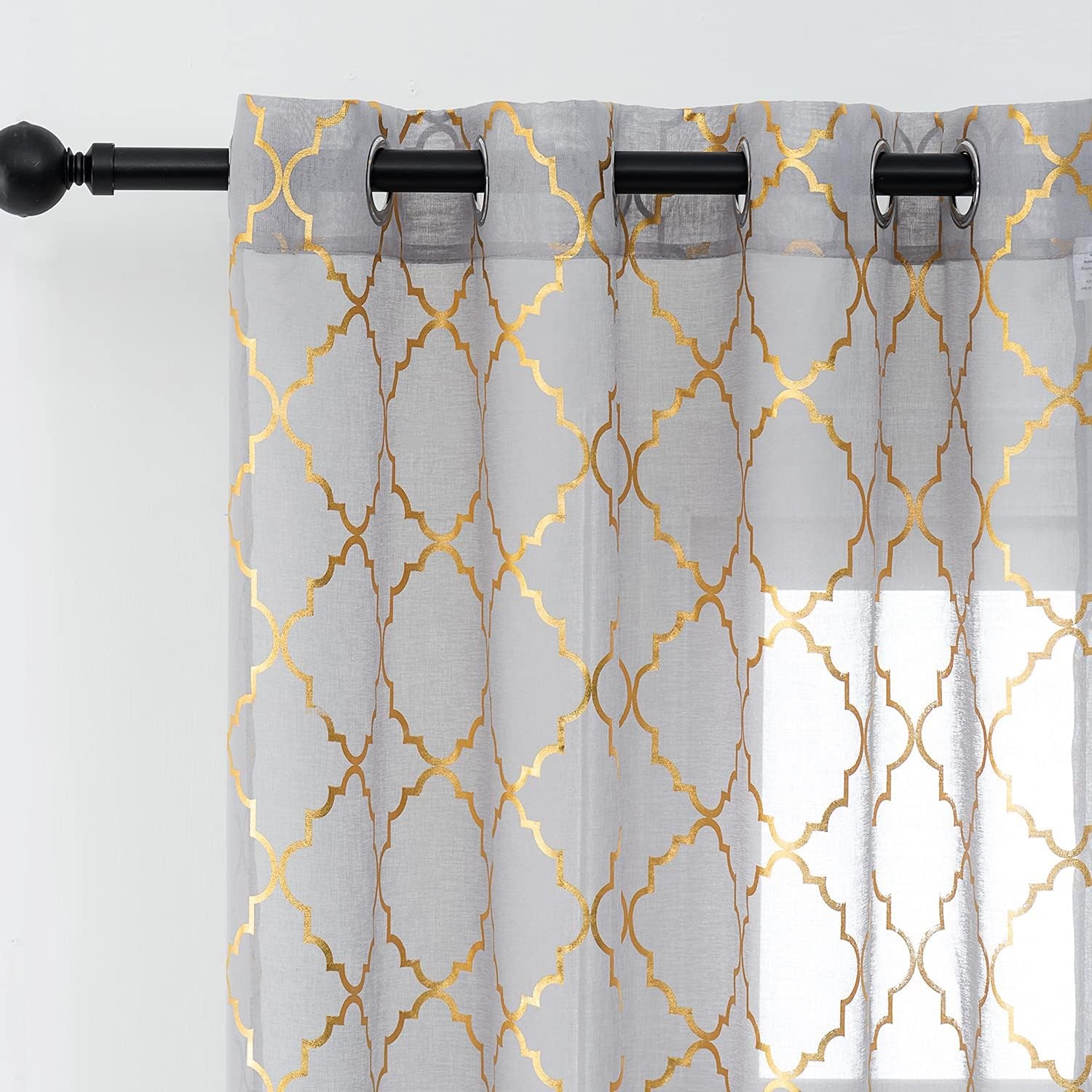 Kotile Grey Voile Curtains 2 Panels - Metallic Gold Foil Geometric Moroccan Tile Gray Eyelet Net Curtains for Bedroom, 66 x 90 Inch, Grey Gold