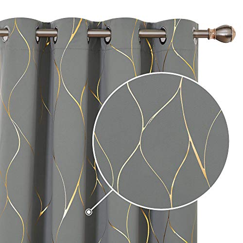 Deconovo Thermal Insulated Blackout Curtains, Gold Wave Foil Printed Eyelet Curtains for Kids Bedroom, 52 x 54 Inch (Width x Length), Grey, One Pair