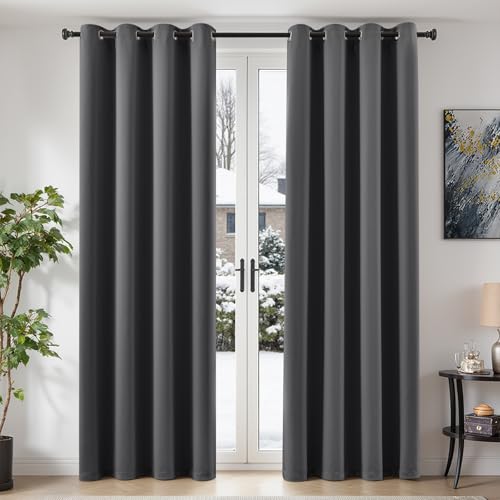 TOPICK Blackout Grey Thermal Curtains for Bedroom 84 Inch Long Drop Pair, Black Out Ring Top Curtains for Living Room, Soundproof Curtains and Drapes for Sliding Door, W52 x L84 Inch