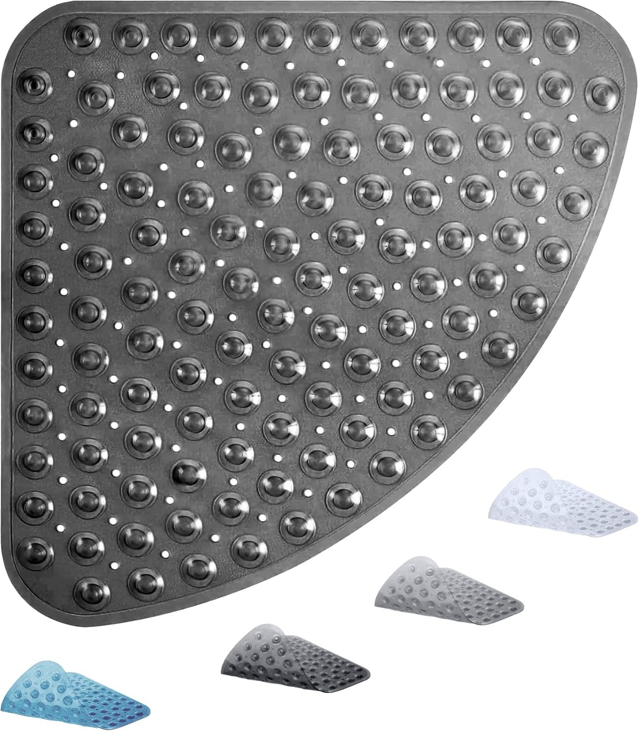 Corner Shower Mat Non Slip Anti Mould, 54 x 54 cm Rubber Quadrant Shower Mat for Inside Shower, Triangular Shower Mats with With Suction Cups and Drain Holes, Curved Bath Mat for Wet Room (Grey)