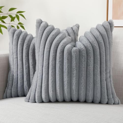 decorUhome Faux Fur Cushion Covers 60x60 cm Set of 2, Decorative Soft Plush Striped Neutral Pillow case 24X24 Inch with Velvet Back for Sofa, Bed, Living Room Home Decor, Grey