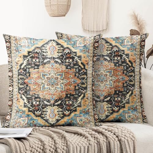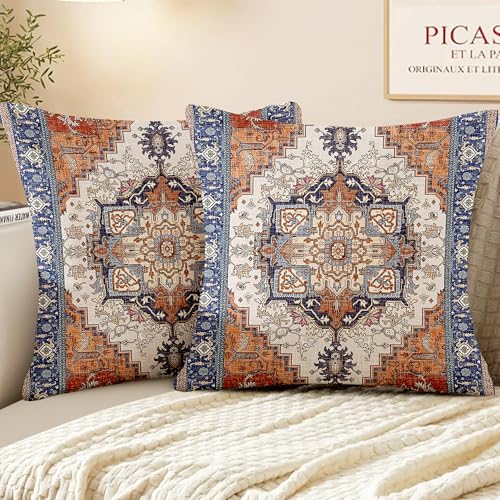 XPHZZL Pack of 2 Bohemian Style Linen Decorative Cushion Covers 60x60 cm Square Throw Pillow Covers 24x24 Inch Boho Style Pillowcases for Outdoor Home Decor Sofa Bedroom Car - Blue Edge Orange