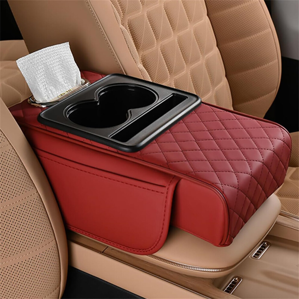 Multifunctional Car Armrest Cushion with Storage Box and 2 Cup Holders, Heightening Pad in Red Color
