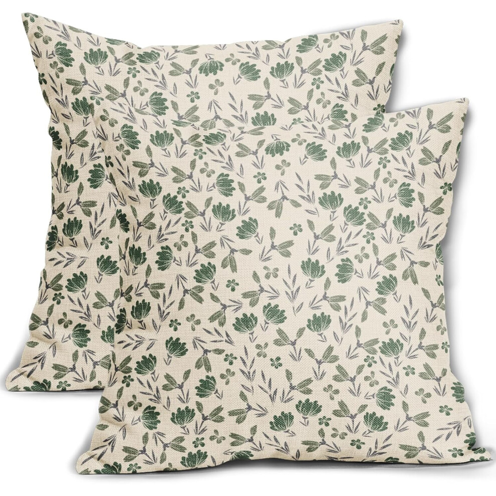 Spring Daisy Floral Pillow Covers 18x18", Sage Green/Brown/Beige, Vintage Block Print, Set of 2, Farmhouse Decor, Compatible with Standard Cushions