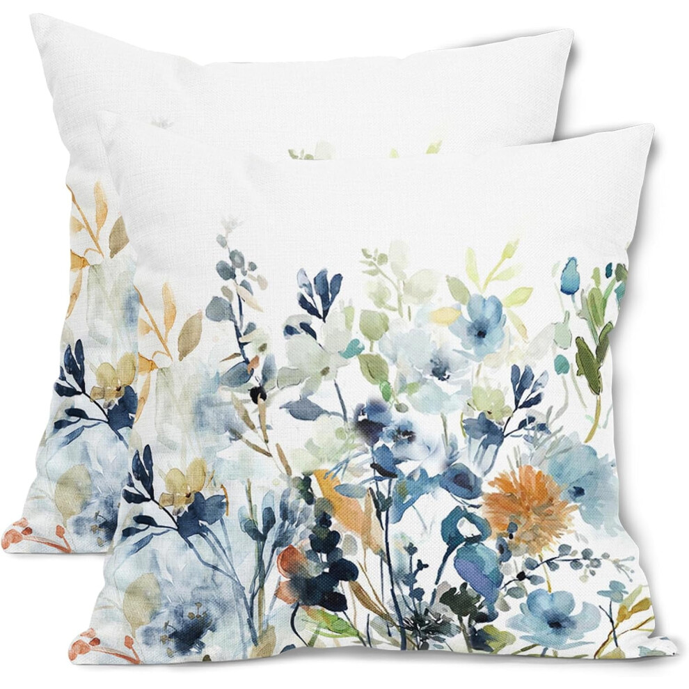 Spring Floral Throw Pillow Covers 18x18", Blue & Sage Green Cotton-Linen, Outdoor/Indoor Use, Compatible with Standard Cushions (Pack of 2)