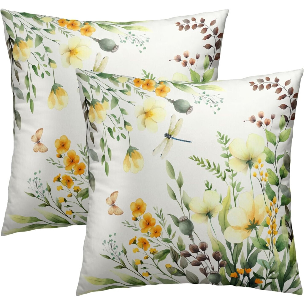 Spring Sage Green Leaf & Floral Pillowcase Set (2 pcs, 20x20"), Yellow Eucalyptus Design, Compatible with Standard Square Cushions