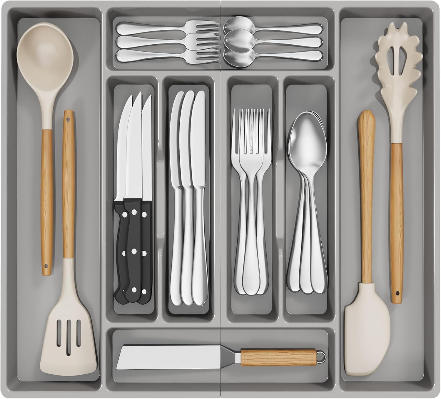 Cutlery Tray for Kitchen Drawer, Silverware Organizer with Expandable Design Adjustable Dividers Smooth Finish Stain Resistant Storage Solution,