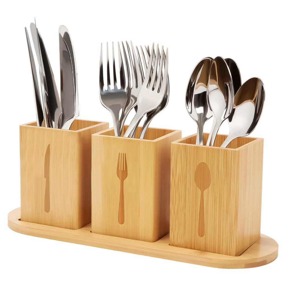 Retro Wooden Cutlery Rack With 3Compartment Utensil Crocks And Cutlery Trays, Nature Color Kitchen Utensil Holder