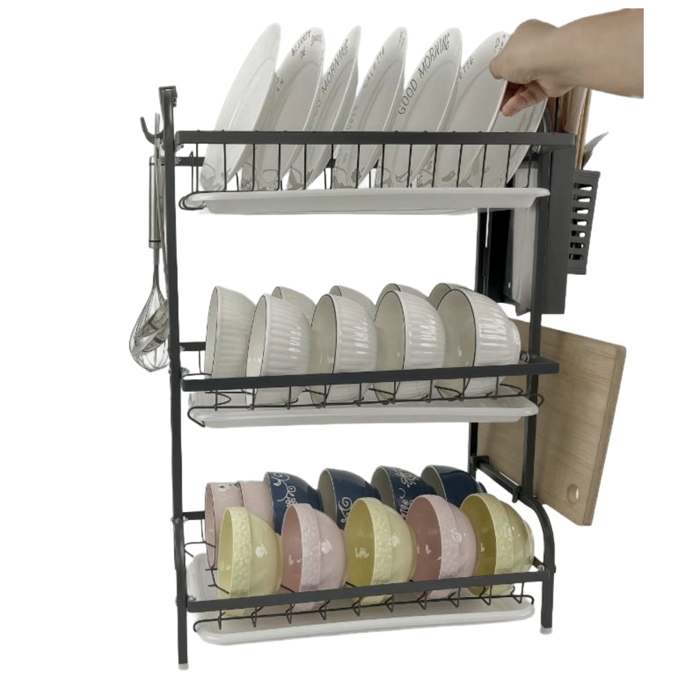 Dish Sink Drainer Rack 3-Tier with Drip Trays Cutlery Holder Hooks