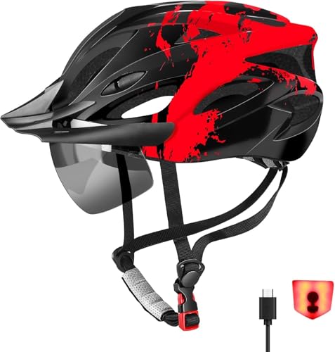Victgoal Bike Helmet with USB Rechargeable LED Light Removable Magnetic Goggles Visor Breathable MTB Mountain Bicycle Helmet for Unisex Men Women Adjustable Cycle Helmets (M: 54-58 cm, Black Red)