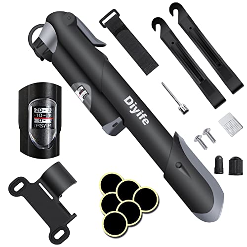 Diyife Bike Pump with Pressure Gauge, [120 PSI] [17 in 1] Mini Bicycle Pump for All Bikes, Ball Pump with Needle, Glueless Patch Kit, Cycle Valve Caps and Frame Mount, Fit Presta and Schrader Valve