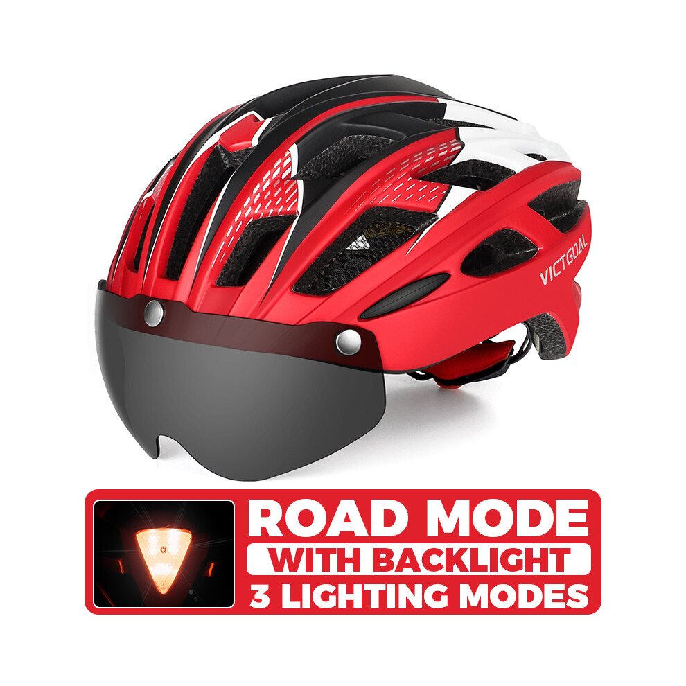 (CHINA, Red Helmet) Adults Bike Helmet Bicycle Helmet with Detachable Magnetic Goggles & Safety LED Rear Light Cycling Helmets Men Women