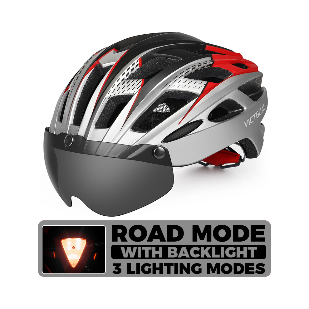 (CHINA, Silver Helmet) Adults Bike Helmet Bicycle Helmet with Detachable Magnetic Goggles & Safety LED Rear Light Cycling Helmets Men Women