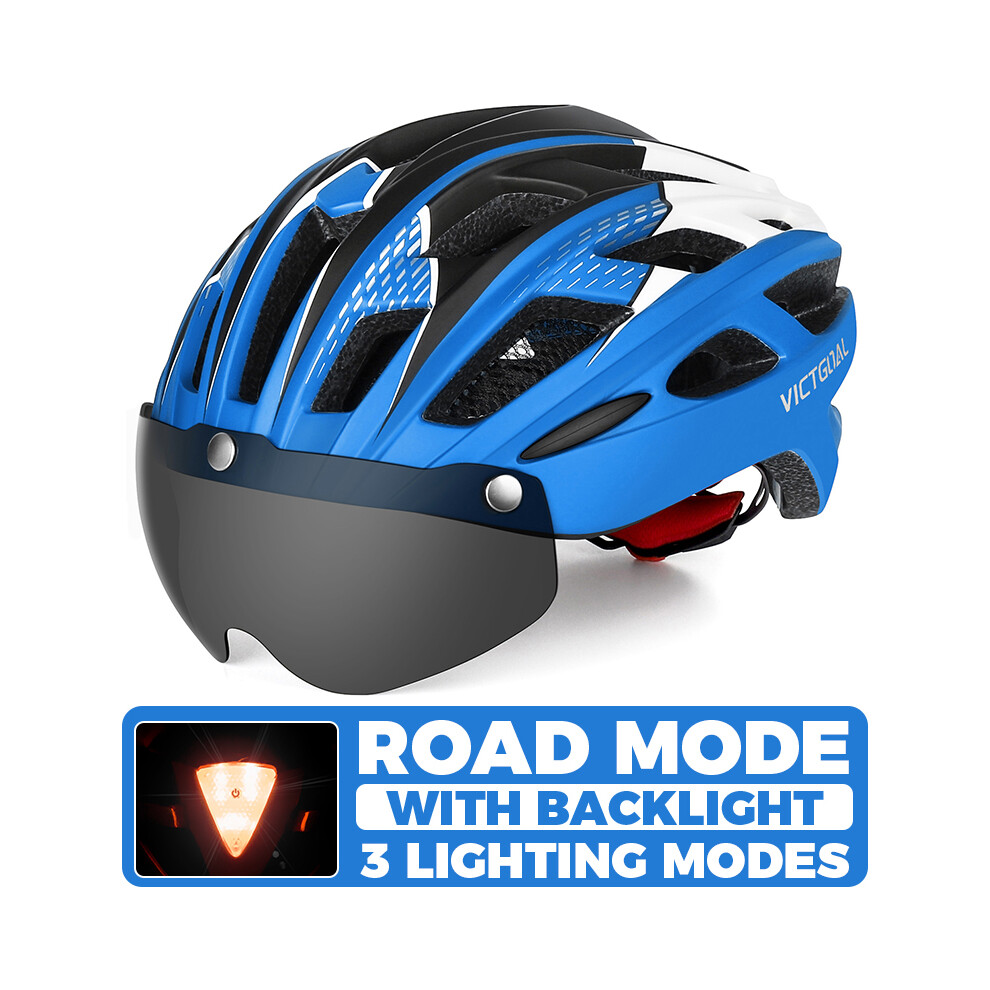 (CHINA, Blue Helmet) Adults Bike Helmet Bicycle Helmet with Detachable Magnetic Goggles & Safety LED Rear Light Cycling Helmets Men Women