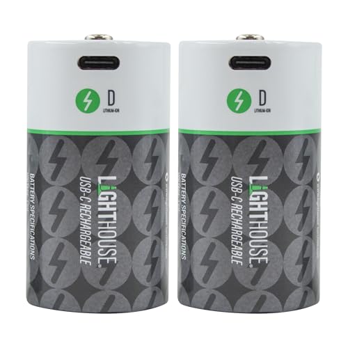 Lighthouse D Type USB-C Rechargeable Batteries Pack of 2 – 4800mAh Li-Ion 1.5V Battery Twin Pack with Fast 2.5h Charge, Up to 1200 Charge Cycles & Included Dual USB-A to USB-C Charging Cable
