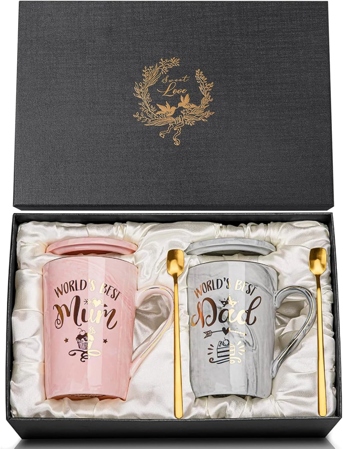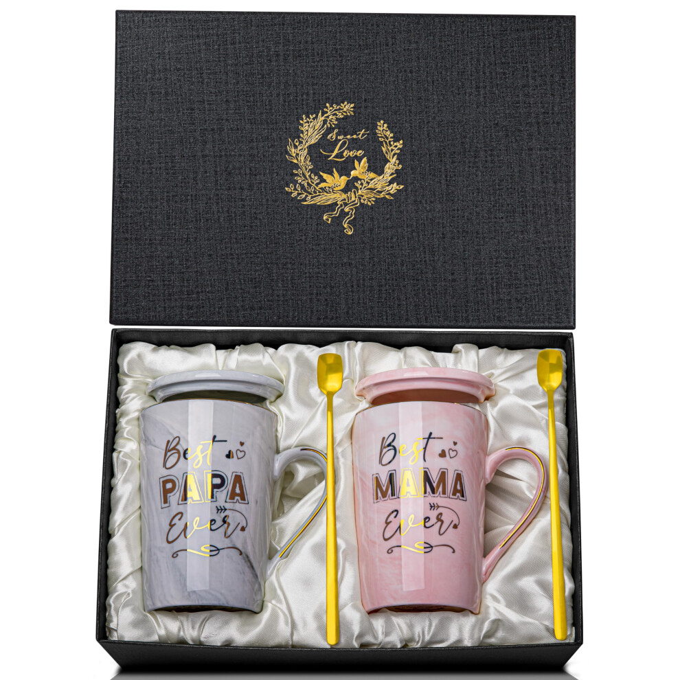 Doublewhale New Parents Gifts, Mum and Dad Mugs, New Mummy and Daddy Gifts, Anniversary Birthday Gift from Daughter Son, 14OZ Gold Print Ceramic Coffee Cup Set with Spoon Lid Card, Nice Gift Box