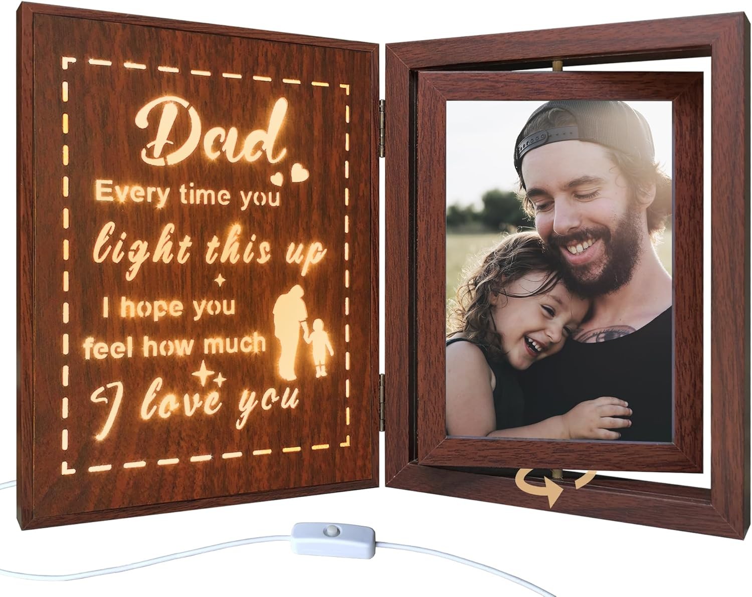 Dad Light Up Photo Frame Gifts from Daughter Son, Wooden Rotating Photo Frame f