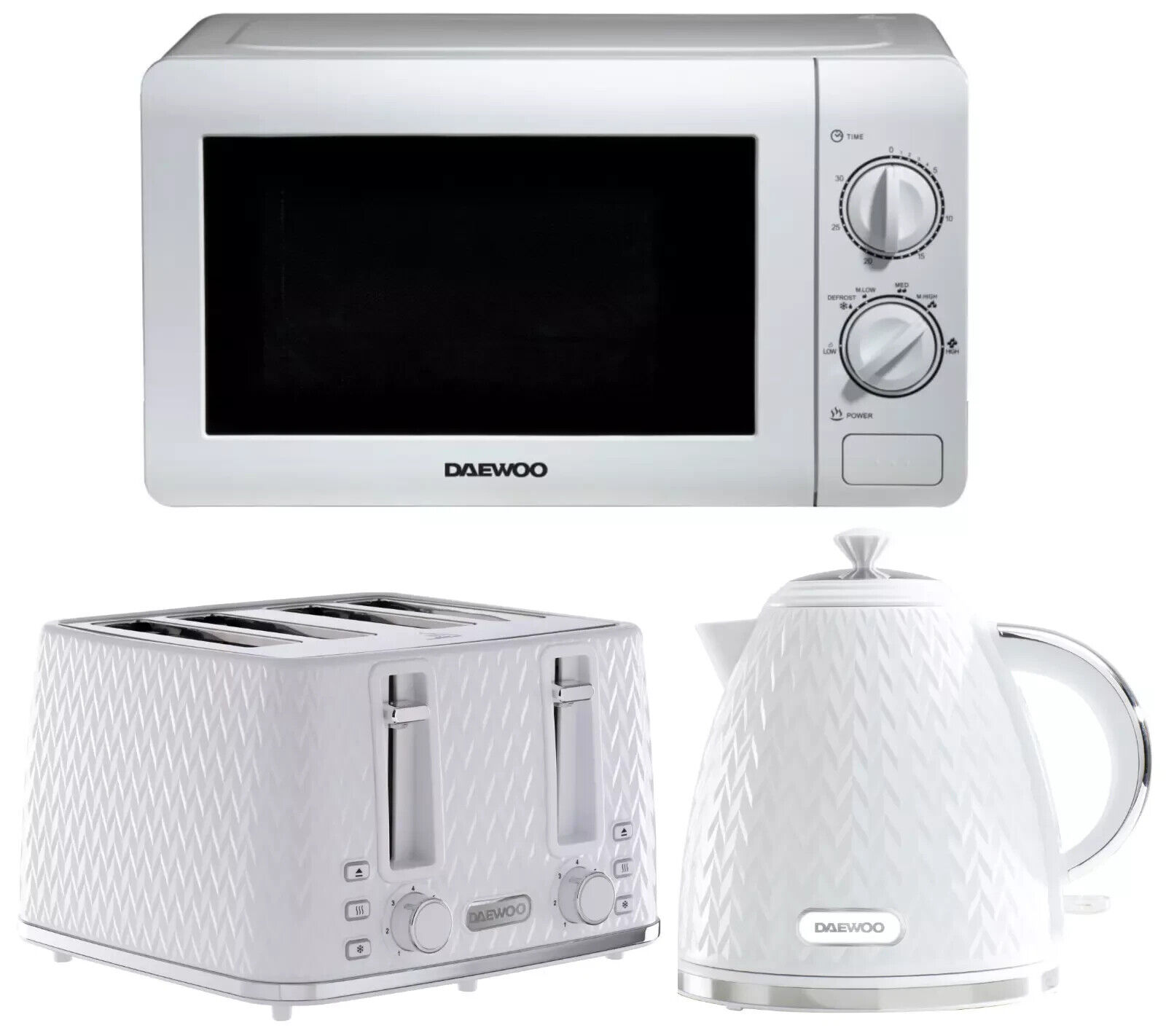 Daewoo Argyle White Kettle 4 Slice Toaster & 800W 20L Microwave SD2075GE Set
