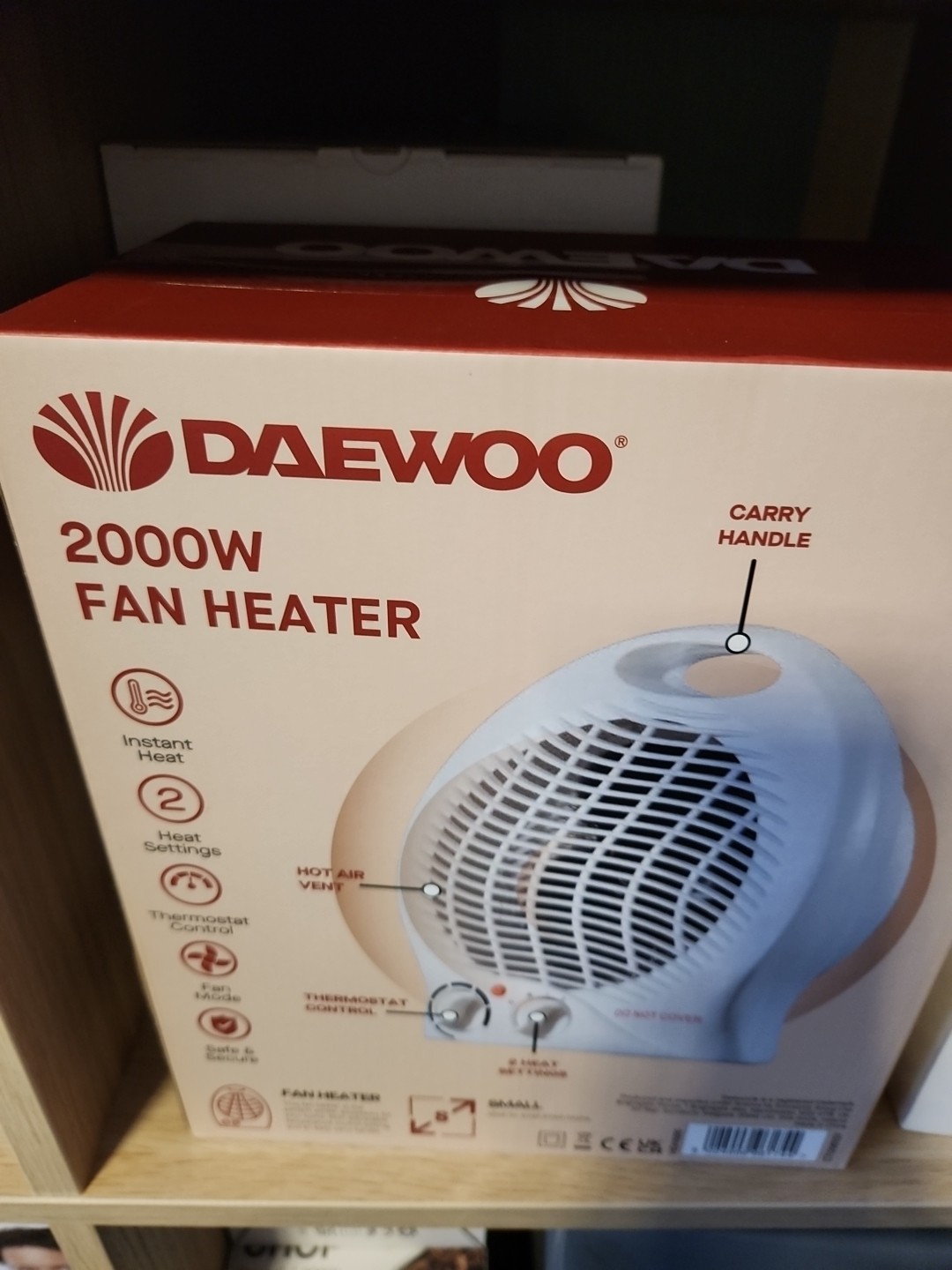 DAEWOO 2000W FAN HEATER. Thermostatic Control, 2 Heat Setting Carrying Handle