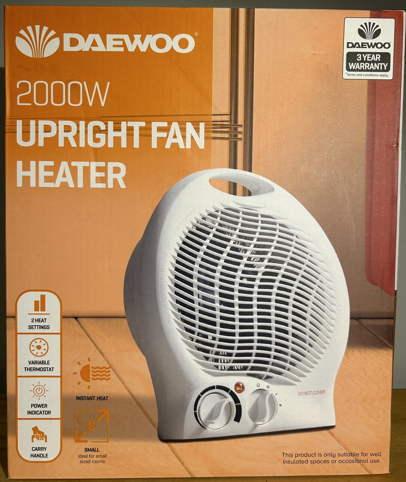 Daewoo 2000W Fan Heater, Upright Fan Heater, Automatic Safety Cut Out, 2 Heat Settings, Variable Thermostat, Power Indicator, Fan Only Setting, Carry Handle, Instant Heat, Ideal For Small Rooms