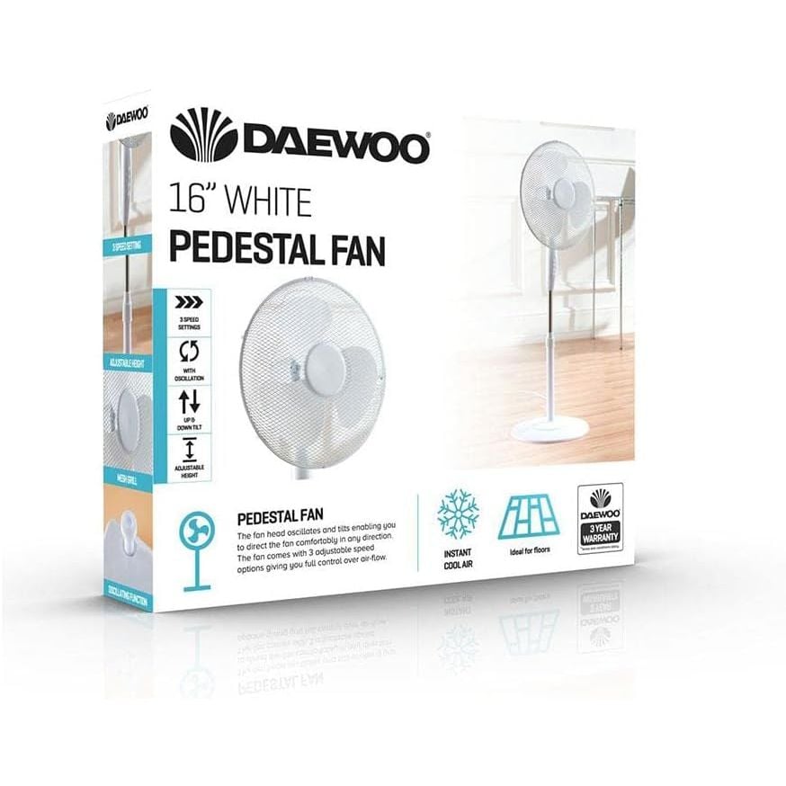 Daewoo 16" White Pedestal Fan (COL1568) | Adjustable Height | 3 Speed Settings | Oscillating Cooling Fan - New