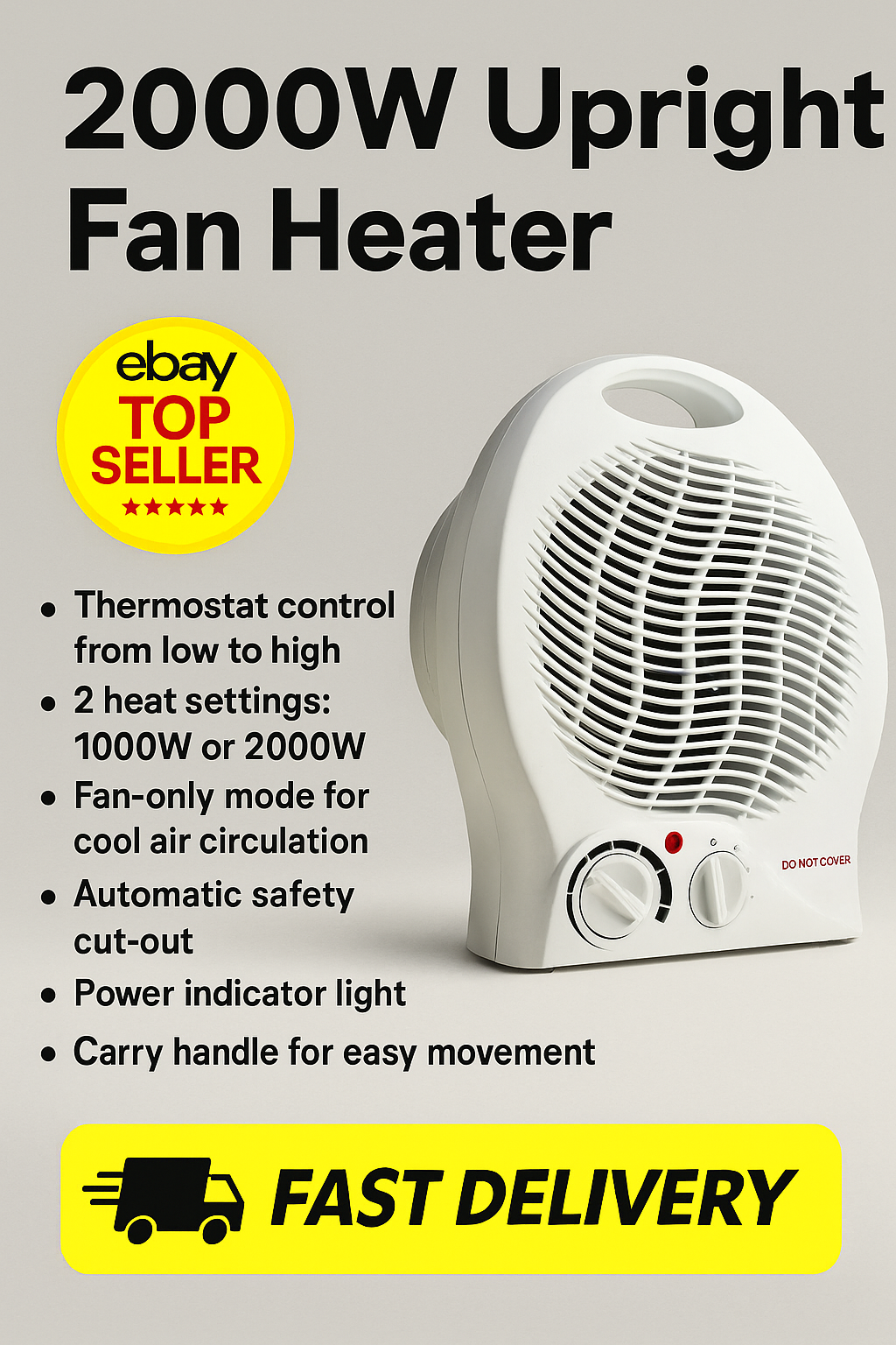 Daewoo 2000W Fan Heater, Upright Fan Heater, Automatic Safety Cut Out, 2 Heat Settings, Variable Thermostat, Power Indicator, Fan Only Setting, Carry Handle, Instant Heat, Ideal For Small Rooms