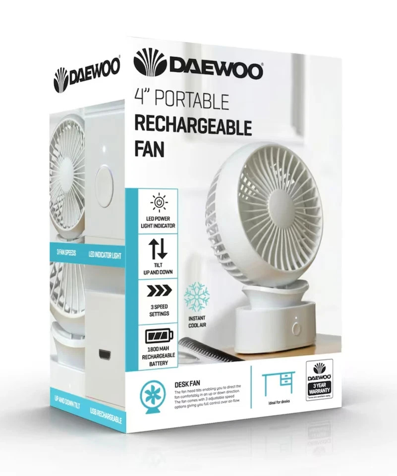 Daewoo 4" Portable Rechargeable Fan Desk Travel 1800Mah Tilt 3 Speed COL1540