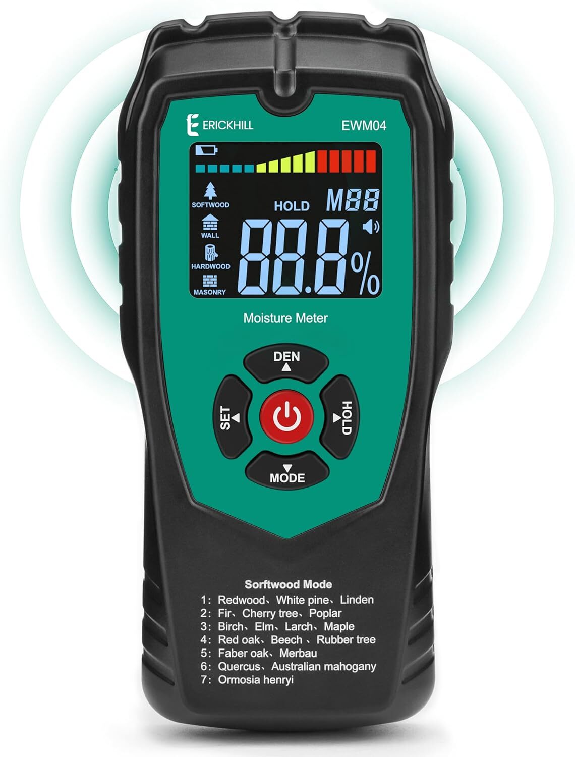 ERICKHILL Wood Moisture Meter, Non-Invasive Damp Meter Detector with 4 Modes, LCD Display with Backlight, Wood and Building Material Dampness Inspection, Moisture Detectors for Wood, Drywall