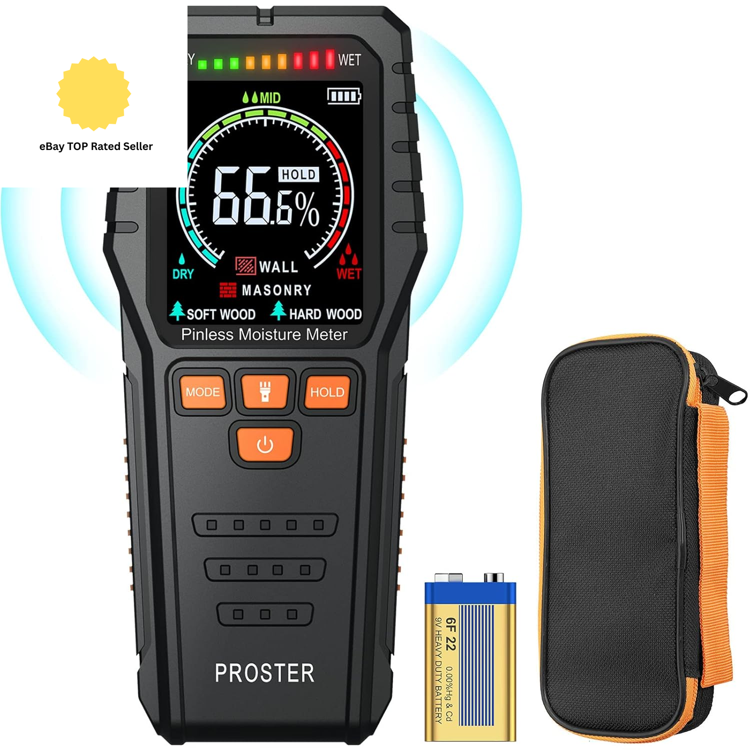 Proster Pinless Moisture Meters - with Backlit LCD Screen Non-Invasive Damp Meter Detects up to 3/4-Inch Below Surface for Non-Destructive Moisture Detection Wallboard Masonry Hardwood and Softwood