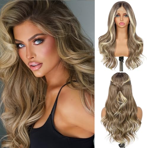 SOMIARIK 13x4 Lace Front Short Wavy Ash Blodne Wigs Ash Blonde with Dark Roots Pre Plucked with Baby Hair Natural Looking 150% Density Heat Resistant Party Date Daily Wear Wig 22 Inch