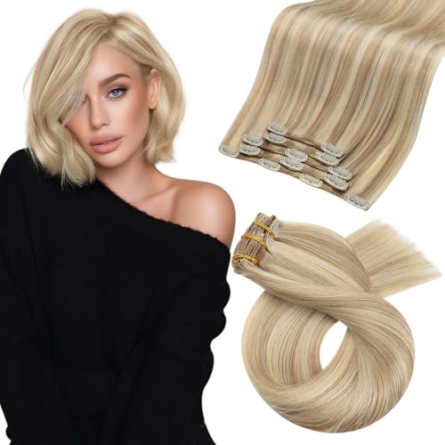 Moresoo Clip in Hair Extensions Real Human Hair Blonde Remy Hair Clip in Extensions Real Human Hair Dark Ash Blonde with Golden Blonde Hair Extensions Clip in Human Hair 5 Pieces/80G #16/22 10inch