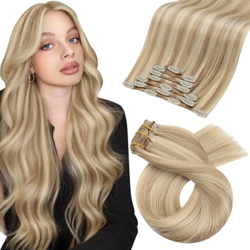 Moresoo Clip in Hair Extensions Real Human Hair Blonde Remy Hair Clip in Extensions Dark Ash Blonde with Golden Blonde Hair Extensions Clip in Human Hair Double Weft 20 Inch 7 Pieces/120g #16/22