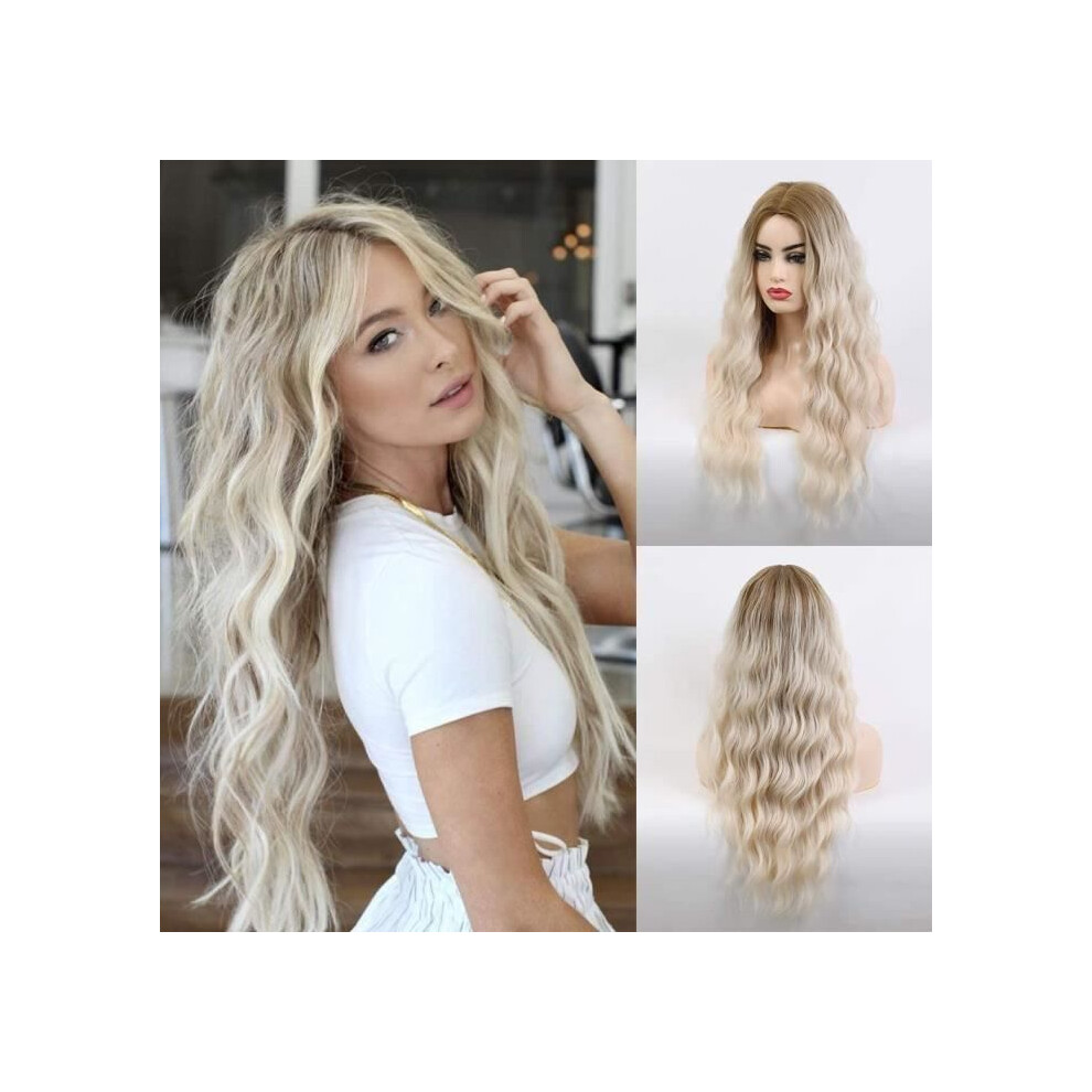 Long Beige Blonde Wig for Women Natural Synthetic Wig Ombre Curly Hair Dark Root Middle Part