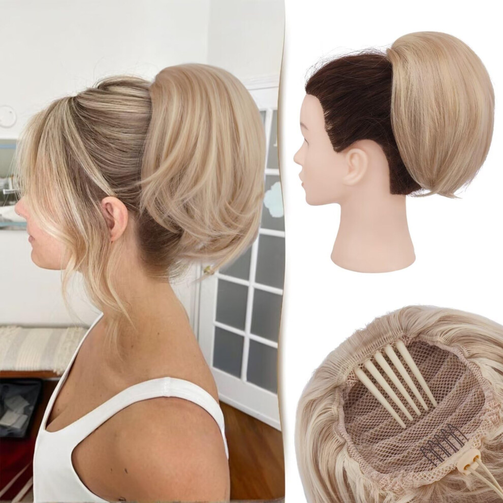 Ponytail Hair Extension 10in Short Synthetic Drawstring Hairpiece with Comb Messy Bun Natural Matte Texture for Women Dark Golden Mix Beige Blonde