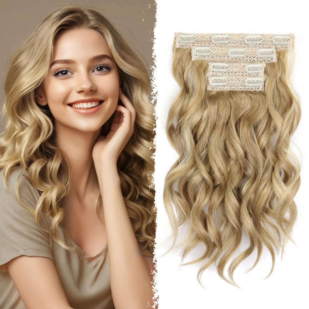 Blonde Clip in Hair Extensions - 14 Inch Wavy Synthetic Hair Extensions Clip ins (Color: Dark Blonde with Beige Blonde Highlights)