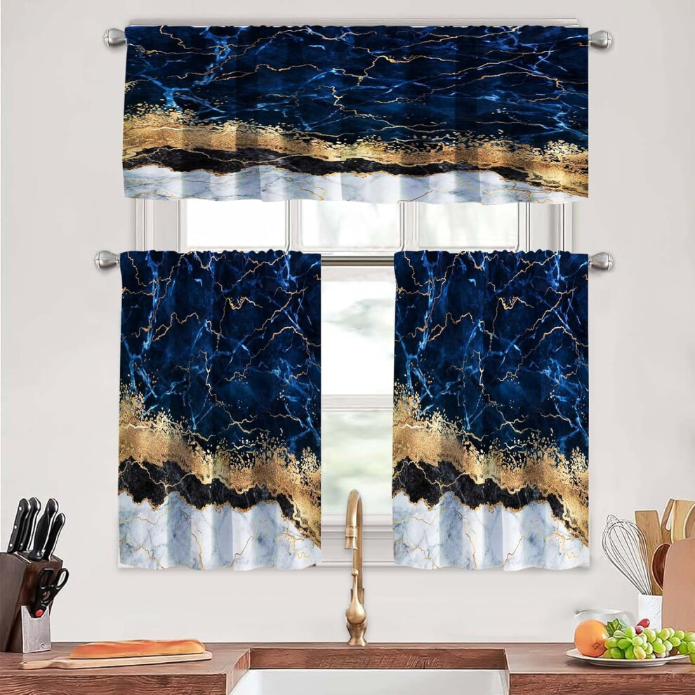 Dark Blue Marble Kitchen Curtains Set (3-Pc): Tiers & Valances, Compatible with 36" Windows
