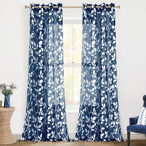XTMYI Blue Curtains 108 Inches Long for Living Room Set of 2 Grommet Top Semi Sheer Leaf Printed Design Patterned Extra Long Curtains for Bedroom Wide 52x108 Inch Length Dark Navy and White