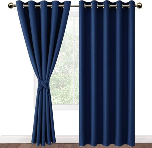 DWCN Blackout Curtains with Tiebacks for Bedroom Thermal Insulated Solid Eyelet Curtains for Living Room,2 Panels,66" Wide x 90" Drop,Dark Blue