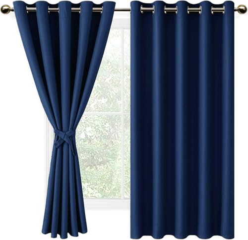 DWCN Blackout Curtains with Tiebacks for Bedroom Thermal Insulated Solid Eyelet Curtains for Living Room,2 Panels,66" Wide x 72" Drop,Dark Blue