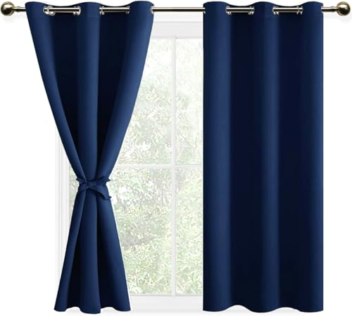 DWCN Dark Blue Eyelet Blackout Curtains with Tie backs Thermal Insulated Short Small Curtains for Bedroom,46" Wide x 54" Drop,2 Panels,