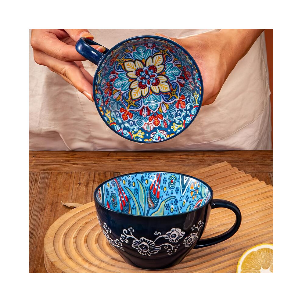 (1 Count, Dark Blue A) Boho Style Ceramic Coffee Cup, 1 Count Vintage Large Capacity Milk Oat Cup, Insulated Travel Mug, Microwave Safe Coffee Mug, Dr