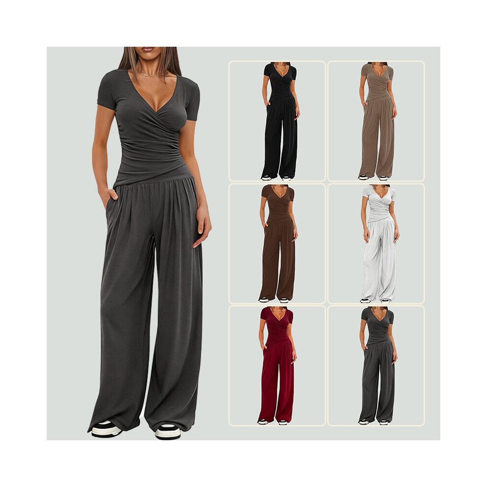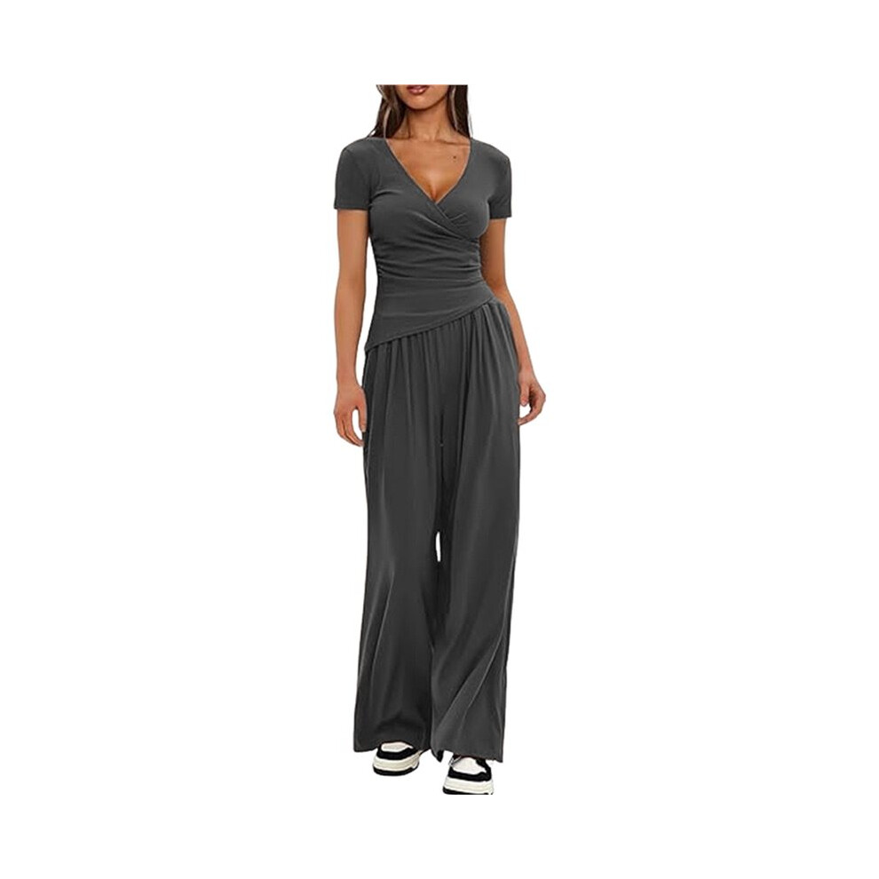 Womens V Neck Short Sleeve Top Wide Leg Pants Casual Comfortable Outfit Set Two Piece Dark Gray [Short Sleeve] M