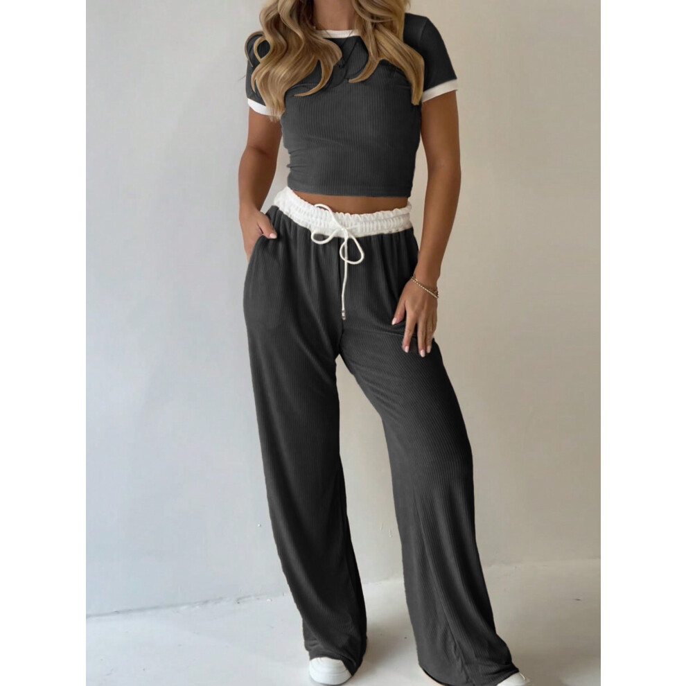 (Dark gray [short sleeves], L) Relaxed wide-leg pants, fashionable casual and comfortable suits for women