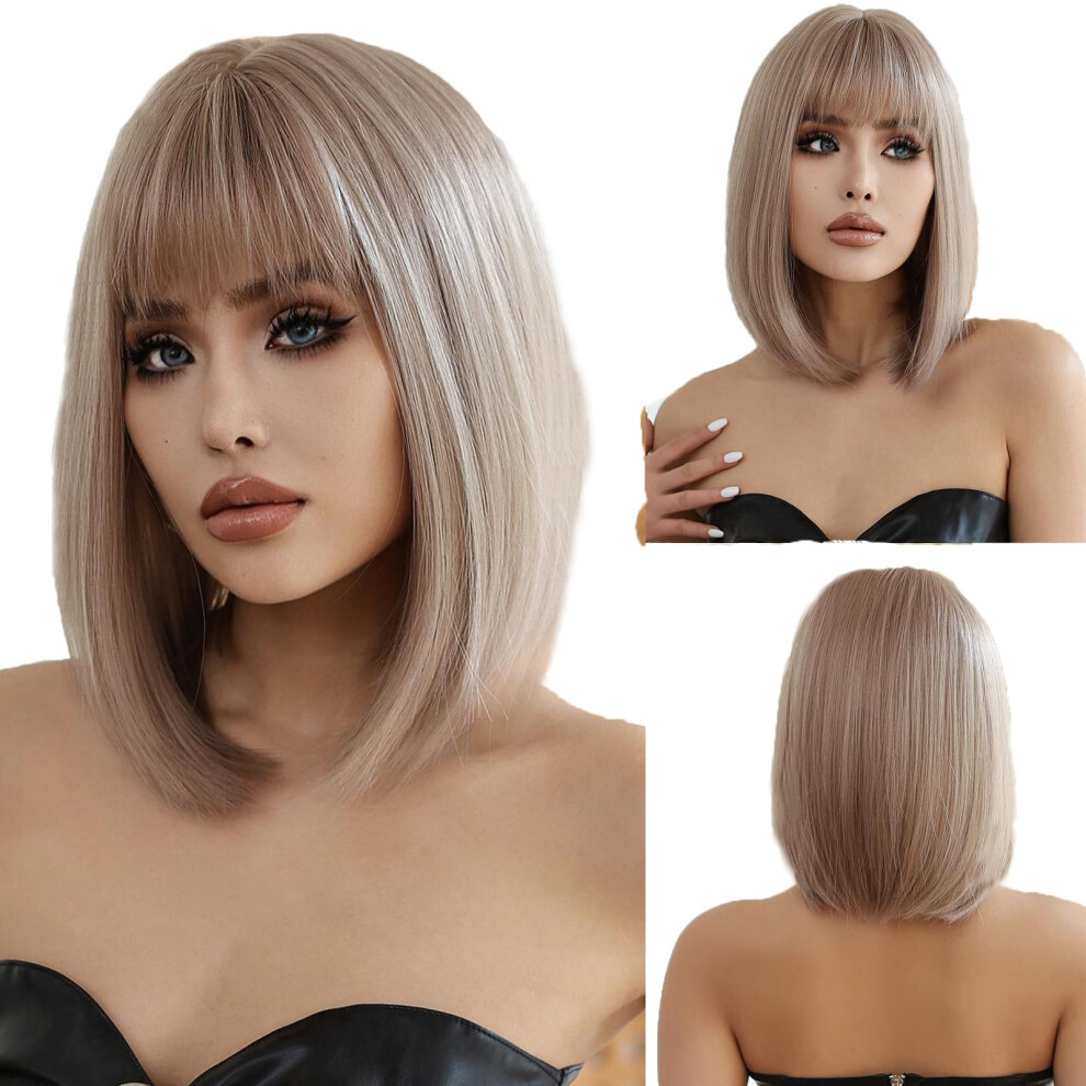Dark Gray Short Bob Wig with Bangs for Women, Synthetic Matte Silk, Natural Look, Adjustable