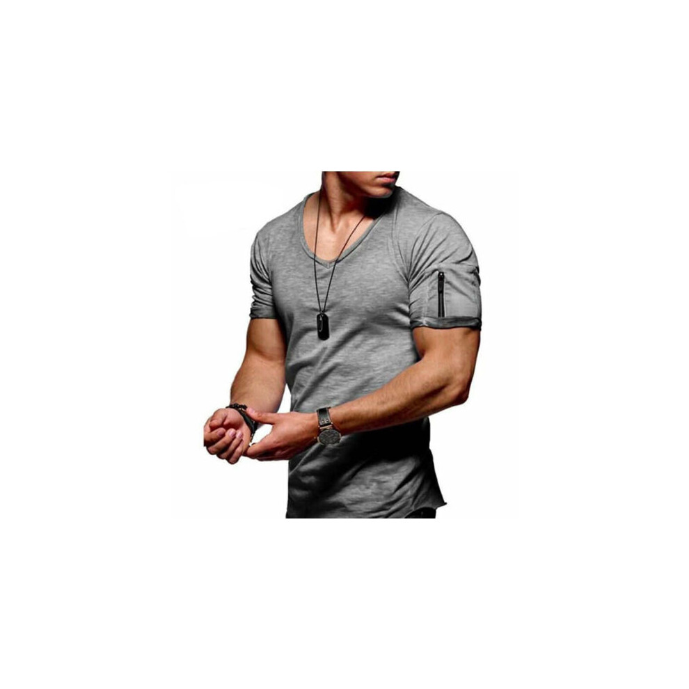 (Dark Gray, L) Men's Short Sleeve V Neck T Shirt Casual Slim Fit Solid Muscle Tee Tops Zipper T