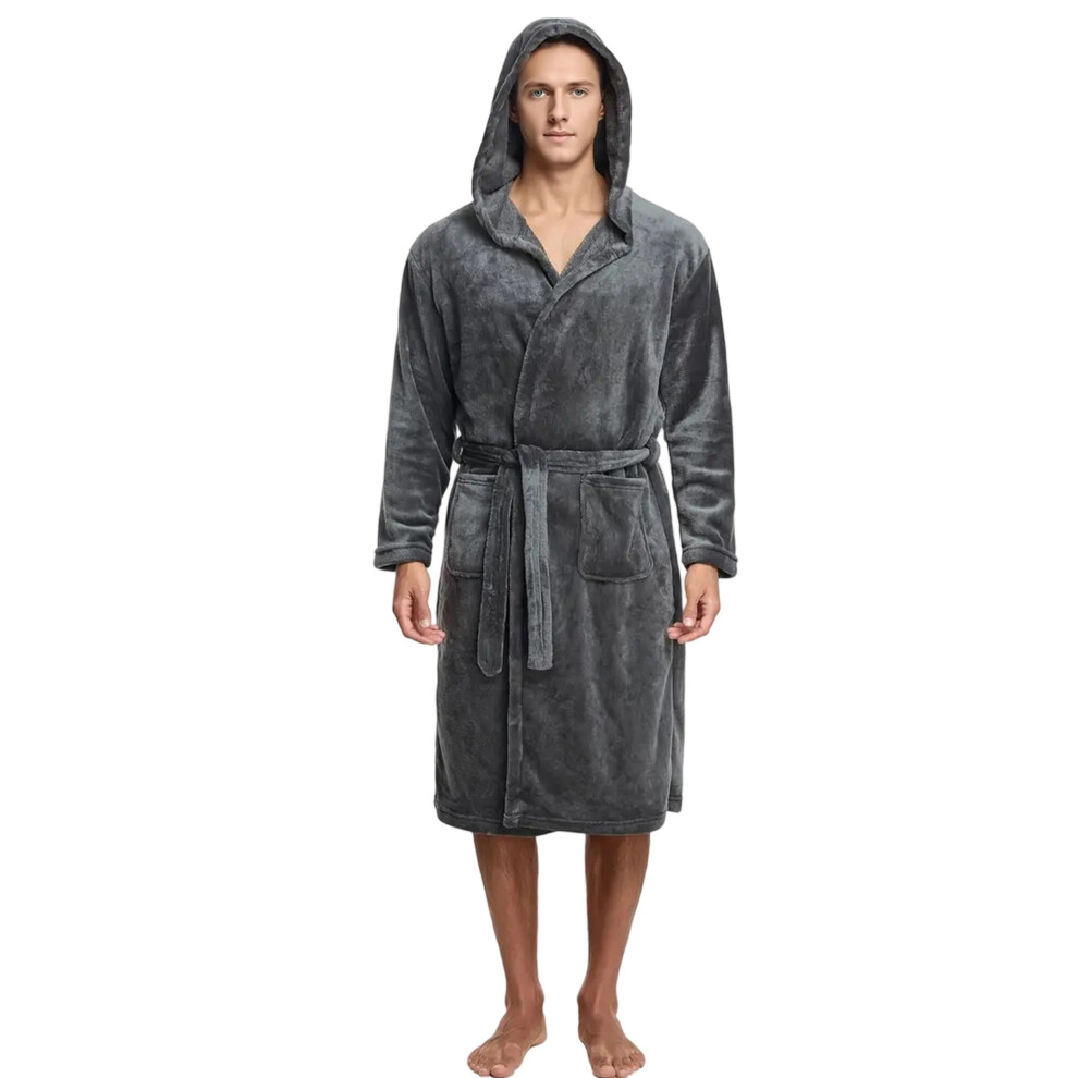 (One Size, Dark Grey) Mens Plush Fleece Hooded Robe, Soft Warm Long Bathrobe with Pockets, Cozy Spa Shower Robe